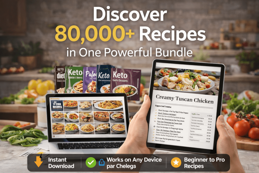 You’ll get instant digital access to a massive collection of 80,000+ recipes including Indian recipes, diabetic-friendly meals, egg dishes, chocolate delights, quick meals, healthy recipes, and much more — all in one bundle.